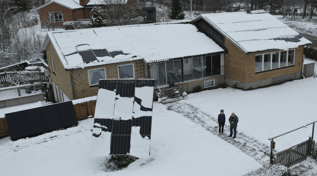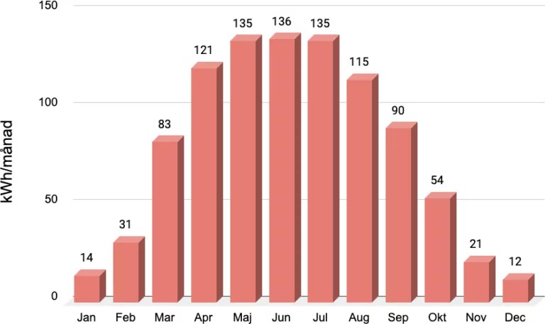 Solceller ger ström även på vintern. Fast när dom är helt täckt med snö, så blir det inget eller mycket litet el. Här nedan ses ett exempel på hur årsproduktionen fördelar sig genom årets alla månader. Exemplet gäller en anläggning i Stockholm på 1 KWp monterad i söderläge med 35 graders lutning.