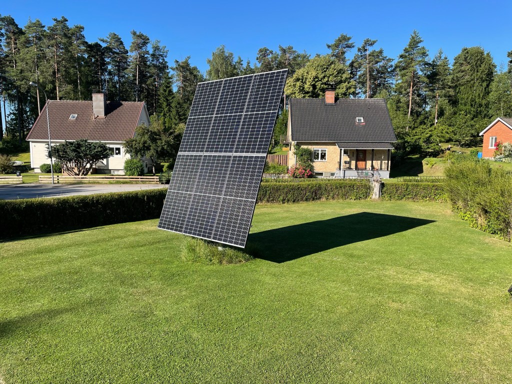 Tack vara solföljaren kan vi få maximalt utbyte av solen. Konstruktionen består utav 6 st 450W paneler. Det blir en samlad effekt om 2,7 KW. Strömmen från solcellerna matas in i en växelriktare som omvandlar likströmmen till 3-fas 400V. På så sätt kan vi använda elen i huset.