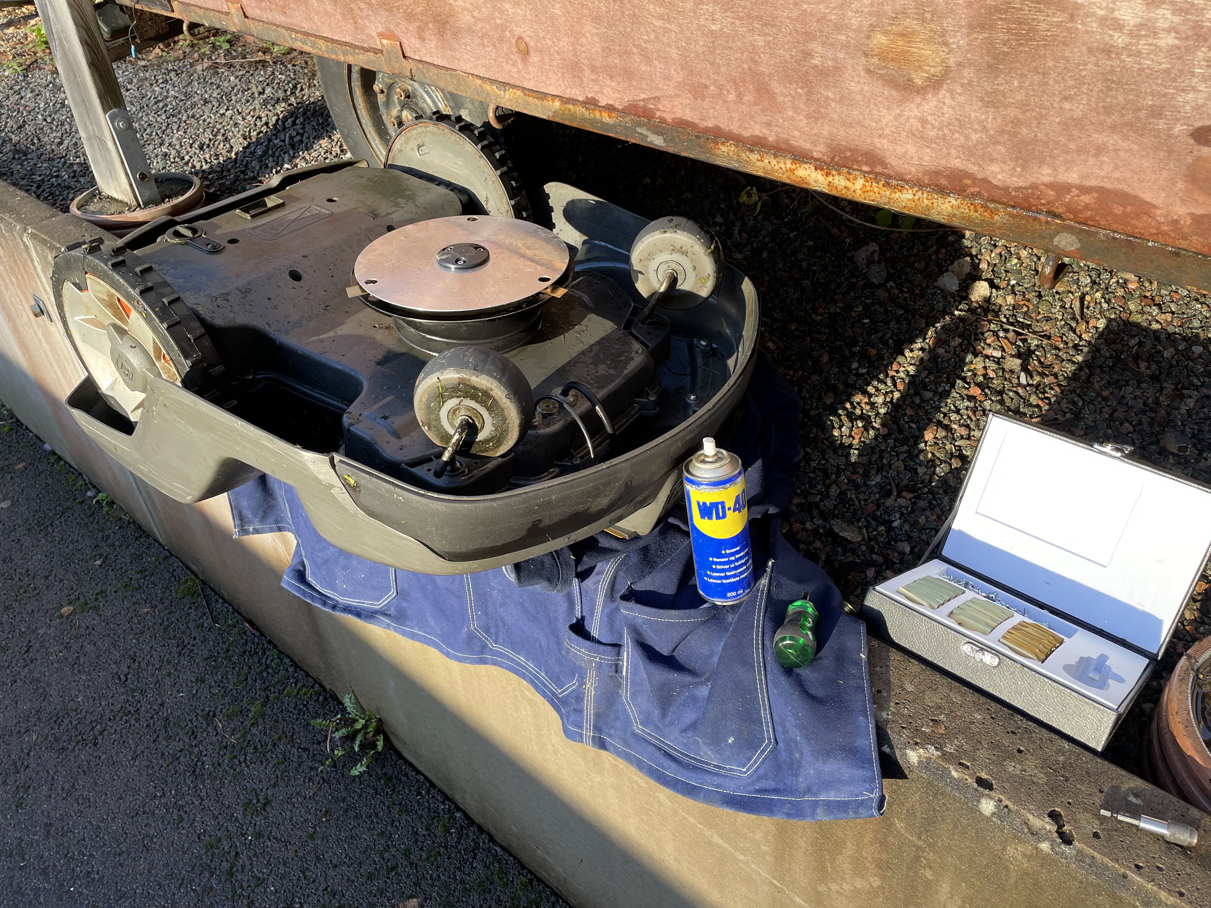 Idag, lördag 2022-11-12 tyckte jag det var dags att låta ”Elsa” få sin vinterservice. Hon har varit ute och trimmat gräsmattan dagligt sen tidigt i våras. Jag började med att plocka av skalet på henne. Sen var det bara och blåsa rent med tryckluft och torka av med fuktig trasa. Hon fick även nya knivar. Lite smörjning och omsorg, så blev hon fin och ren igen!