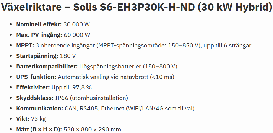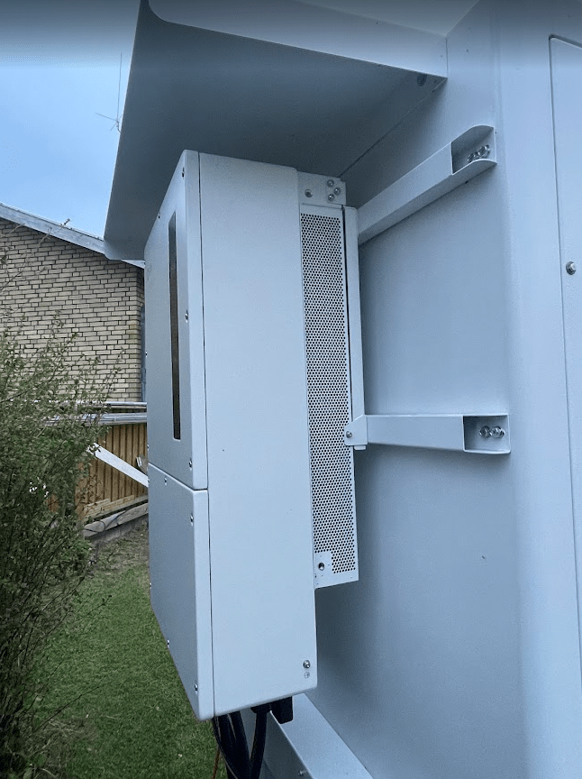 Växelriktaren kommer från Solis och kan leverera upp till 30 kW effekt. Det är en hybridväxelriktare som hanterar all eltrafik mellan fastigheten och elnätet. Den kan förse huset med el även vid strömavbrott i samhället. Vid ett avbrott kopplar den snabbt och automatiskt över till att driva huset med batteriet. Omkopplingen sker på ungefär 0,02 sekunder, så snabbt att det inte märks inomhus. Eftersom växelriktaren hanterar stora strömmar till och från batteriet är den fastmonterad på batteriskåpet. Det är även här AI:n verkar för att göra sitt jobb. Tillsammans med fastighetens elförbrukning analyseras faktorer som marknadspris på el, väderprognoser, temperatur, batteriets aktuella status, solcellernas elproduktion, kostnaden för att cykla batteriet samt fastighetens historiska förbrukning. Baserat på denna data styr AI:n batteriet för att optimalt utnyttja och ge bästa möjliga avkastning. Här nedan syns en bild på växelriktaren.
