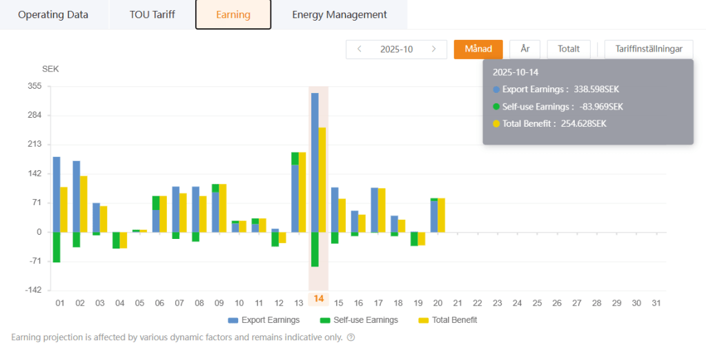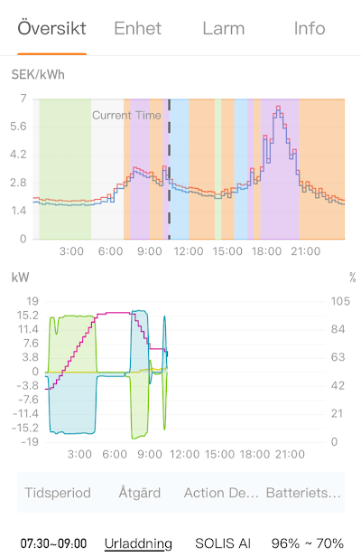 - Batteriets höga kapacitet möjliggör elarbitrage, där överskottsel säljs när elpriset är som högst. En AI hanterar detta automatiskt, utan att jag behöver ingripa.