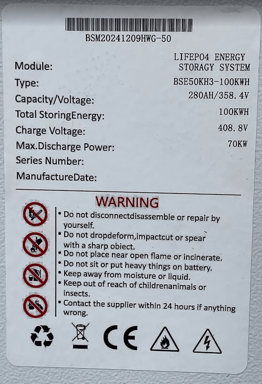 För den tekniskt intresserade kommer här några fakta om batteriet och växelriktaren. Vi börjar med etiketten på batteriet: