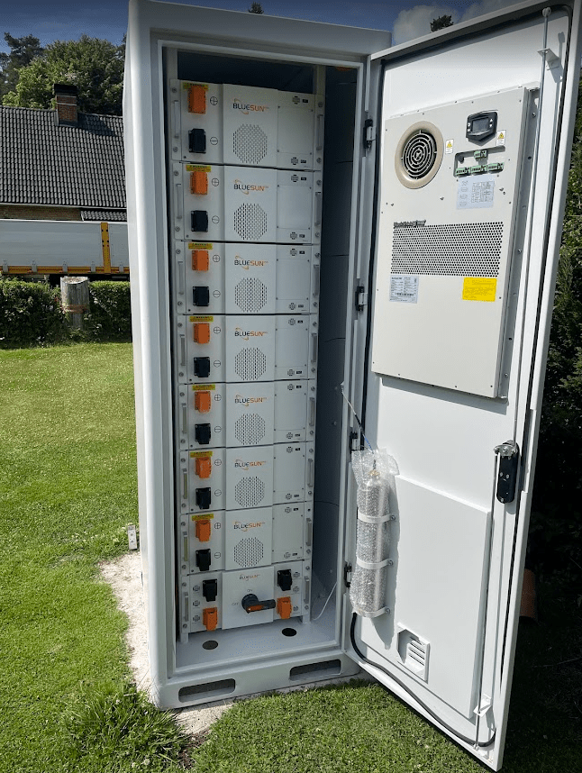 Batteriet är av märket BlueSun Solar och har en kapacitet på 100 kWh. Det är placerat inuti ett klimatkontrollerat och brandsäkert skåp utomhus i trädgården. I marken löper rör som innehåller kablar för el, internet, och diverse andra signaler.